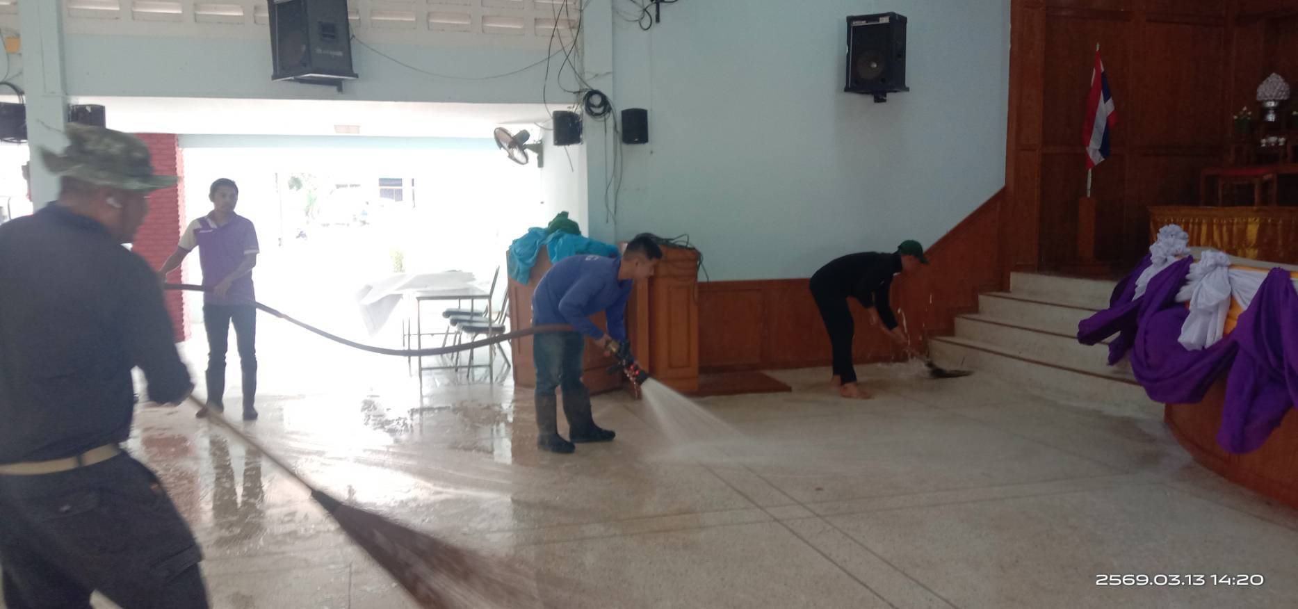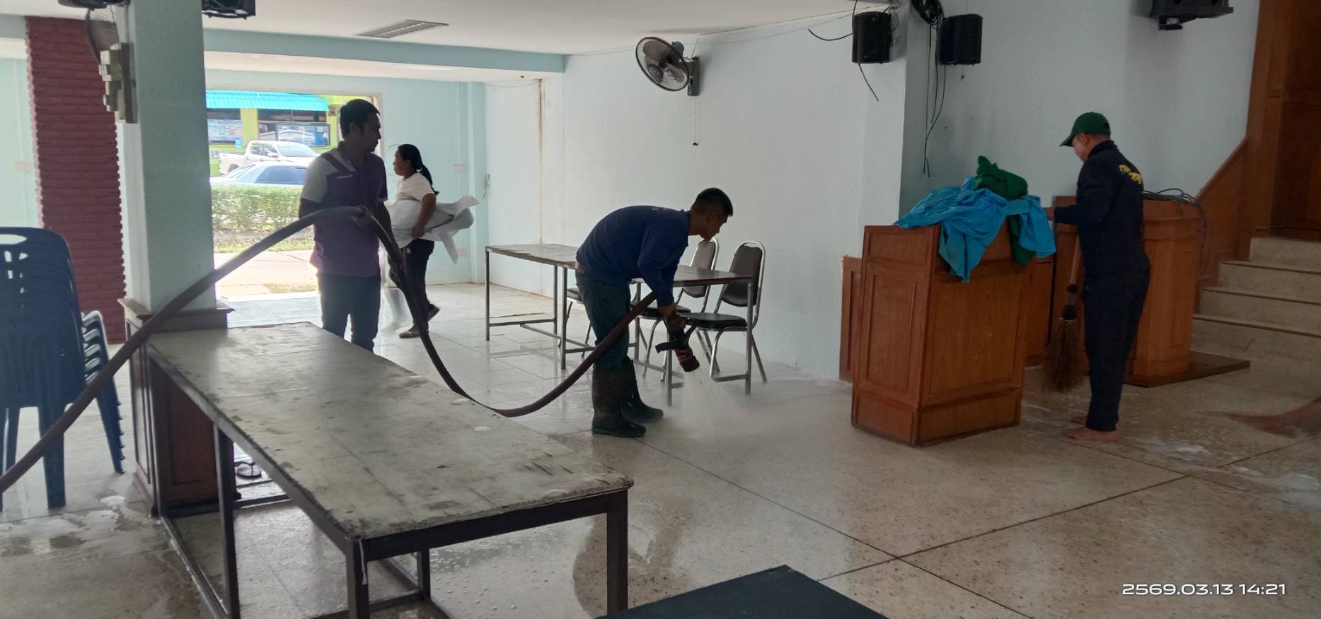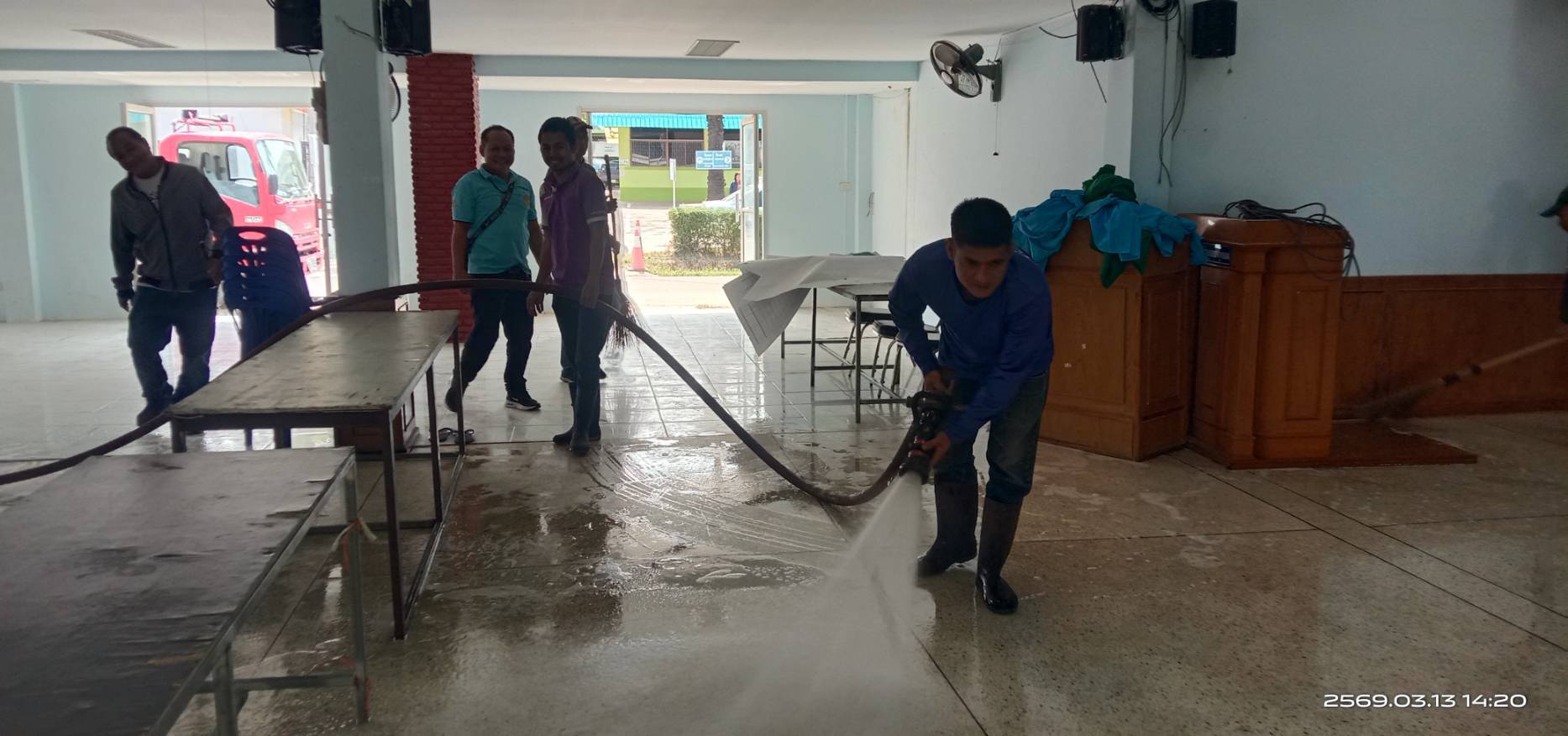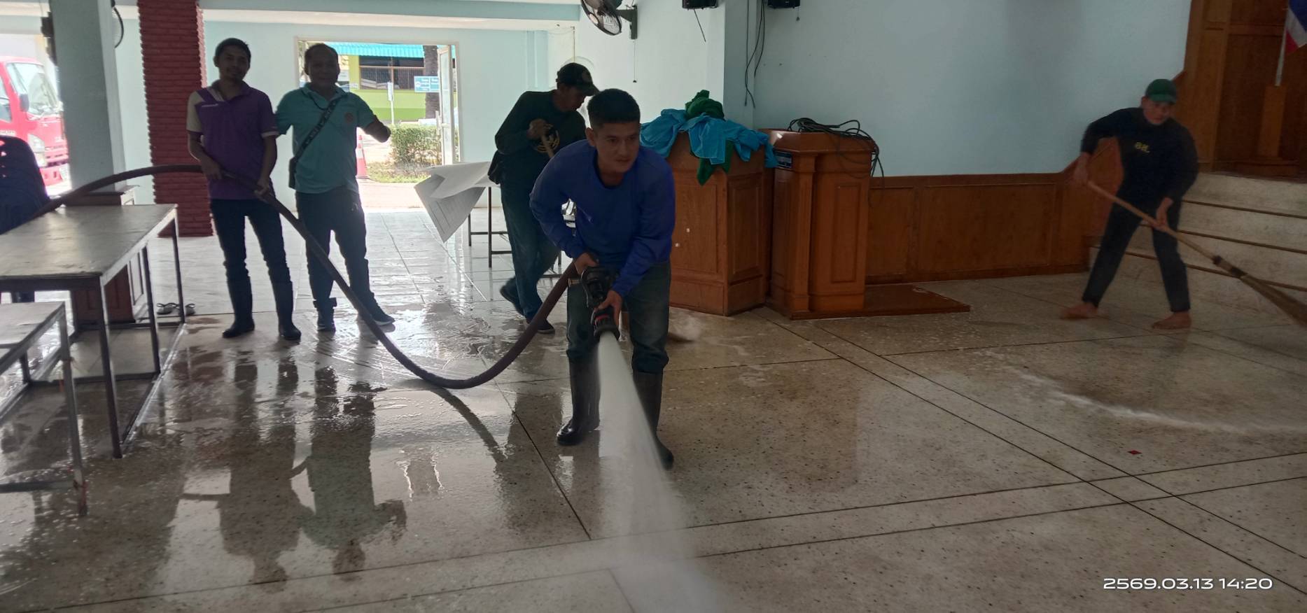 งานป้องกันและบรรเทาสารธารณภัย เทศบาลตำบลธาตุพนมใต้ ลงพื้นที่ทำความสะอาดหอประชุมอำเภอธาตุพนม
